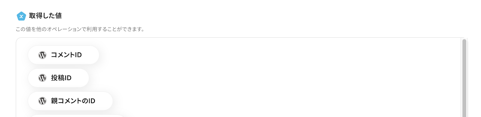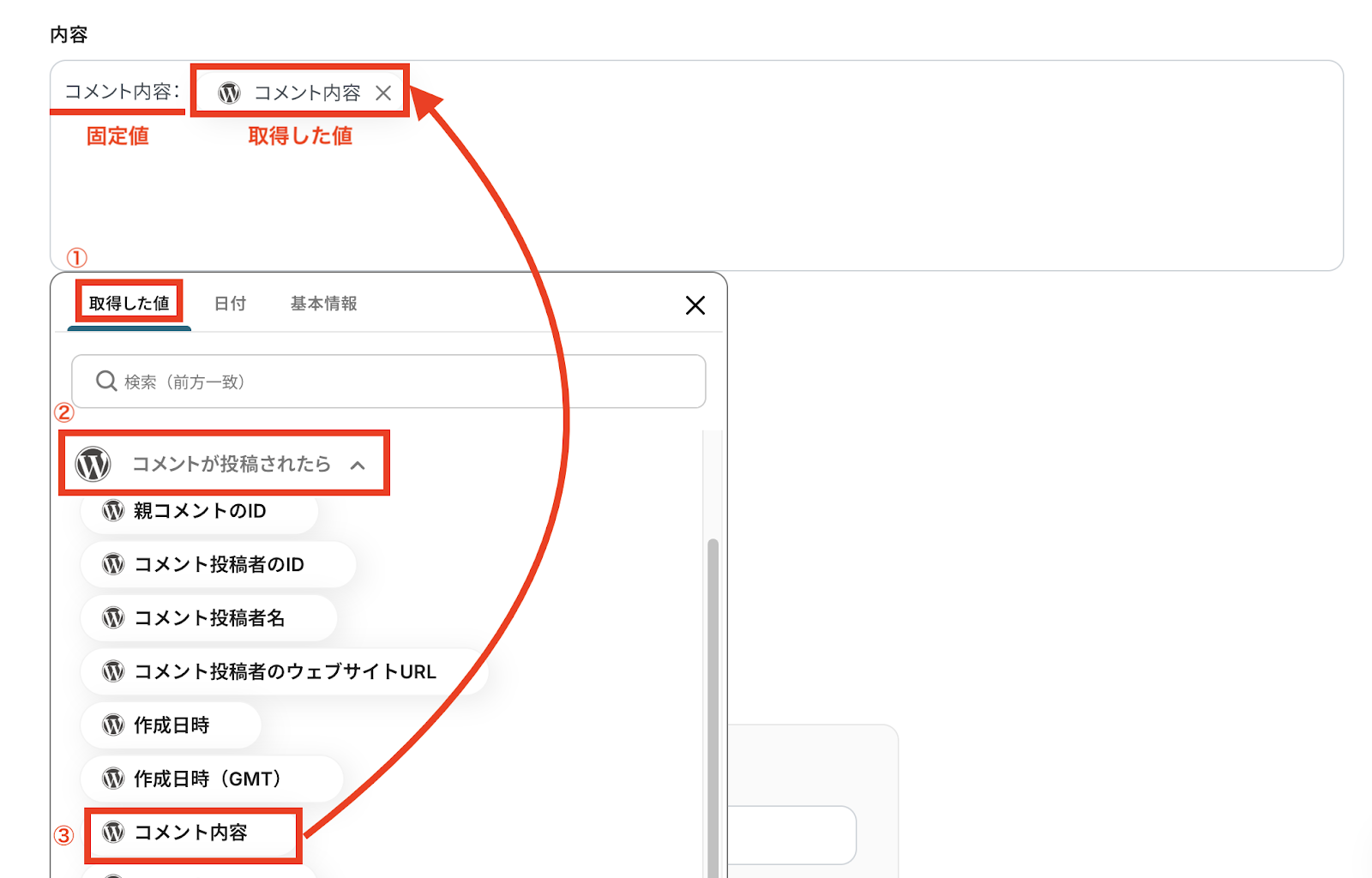 【取得した値の活用方法】 ①入力欄をクリックして「取得した値」を表示 ②「コメントが投稿されたら」をクリック ③「コメントID」など埋め込みたい値を選択