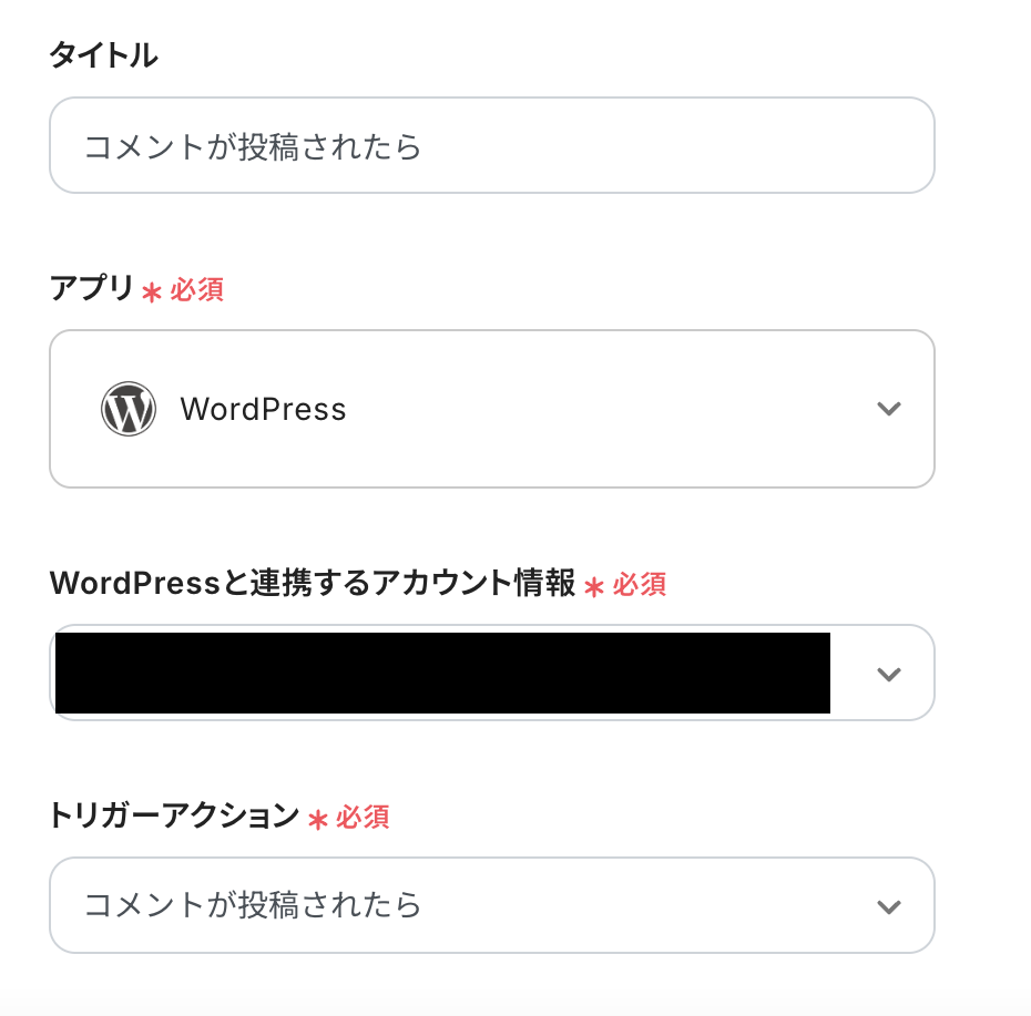 連携アカウントとアクションを選択する 必要箇所を入力していきます。 「タイトル」:必要に応じて変更可能です。分かりやすい名前に修正してもOKです! 「WordPressと連携するアカウント情報」:ステップ1で連携したアカウントが表示されます。 「トリガーアクション」:デフォルトで「コメントが投稿されたら」が選択されているので、変更しないでそのままにしておいてください!