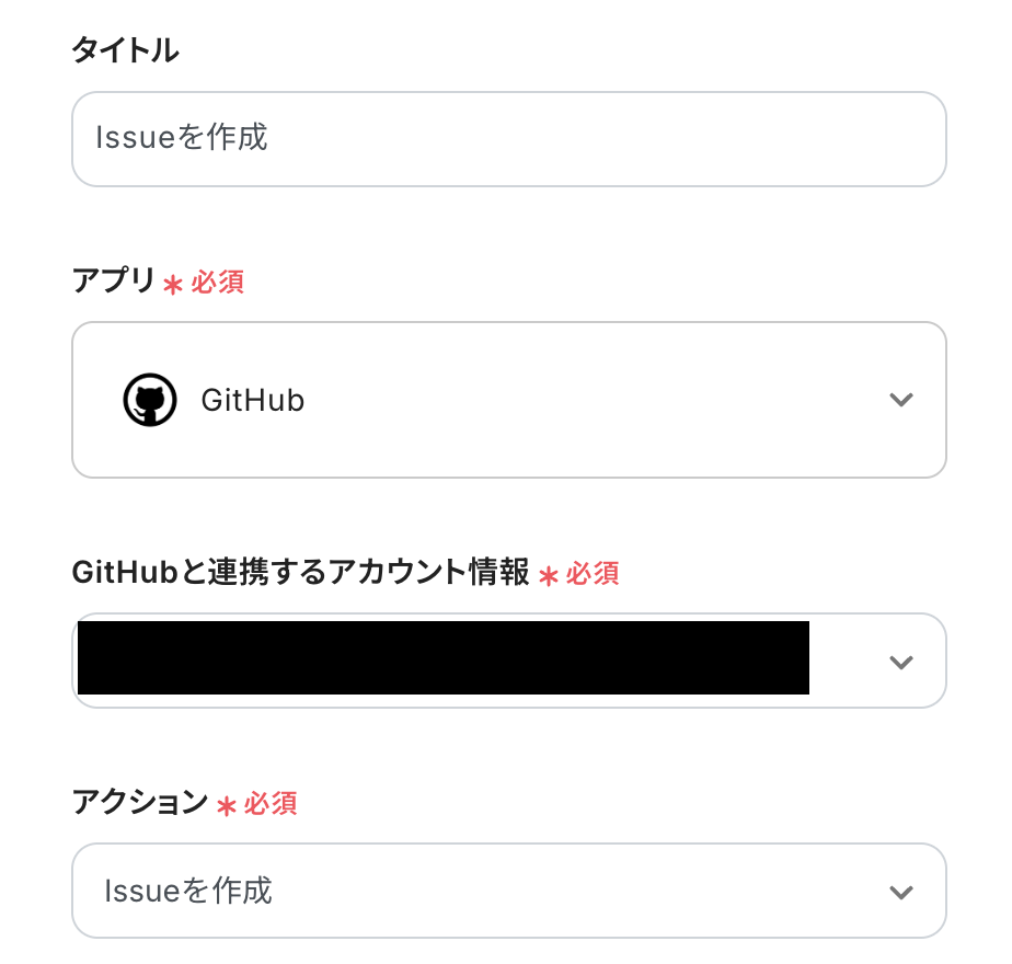 GitHubでIssueを作成するアクションでは、タイトルや本文、担当者などを任意に設定できます。例えば、Issueのタイトルに「【サイトからのフィードバック】」といった固定のテキストを追加したり、WordPressから取得したコメント内容や投稿者名といった情報を変数として本文に自動で埋め込んだりすることが可能です。 ■注意事項