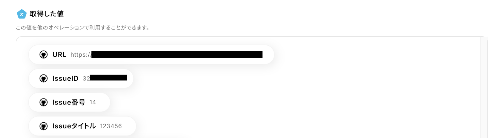 「Issueを作成する」を設定する際、Issueのタイトルや本文などの各項目にZoho Formsで取得した値を埋め込むことができます。 ■注意事項