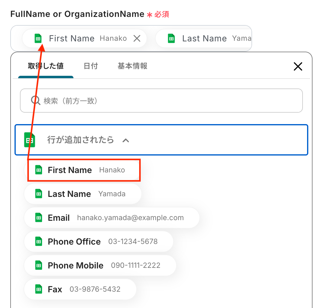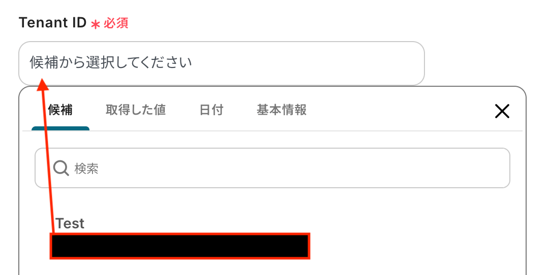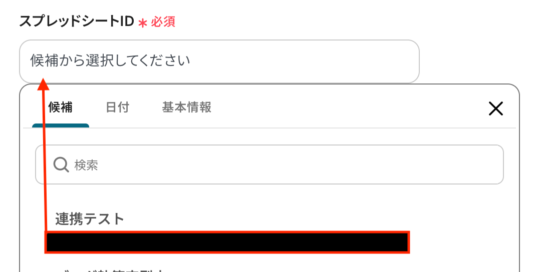 入力欄をクリックすると連携が有効になっているアカウントから候補が表示されるので、対象の項目を選択しましょう。