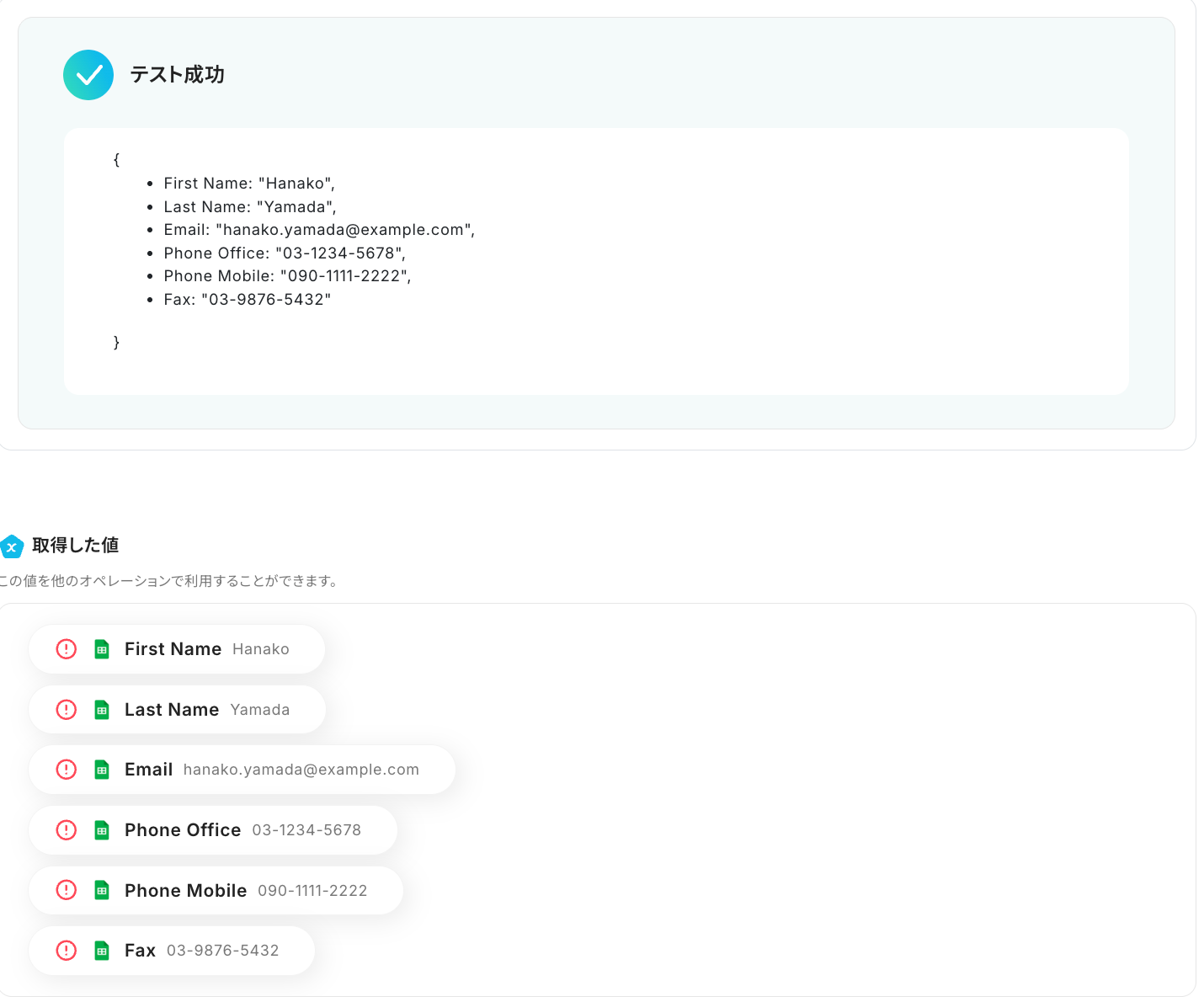 テストに成功すると、Google スプレッドシートに追加された行の情報が表示されます。