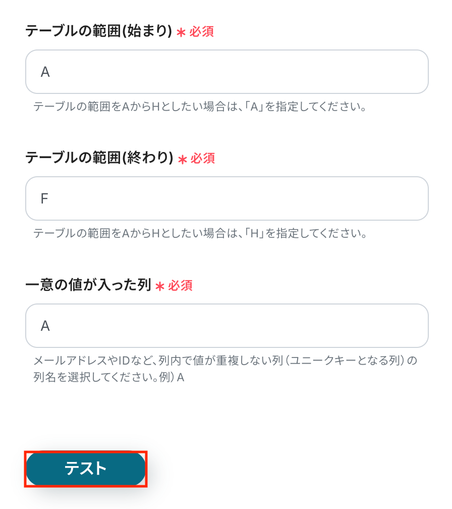 たとえば、AからF列のデータを取得したいときは「A」を指定します。