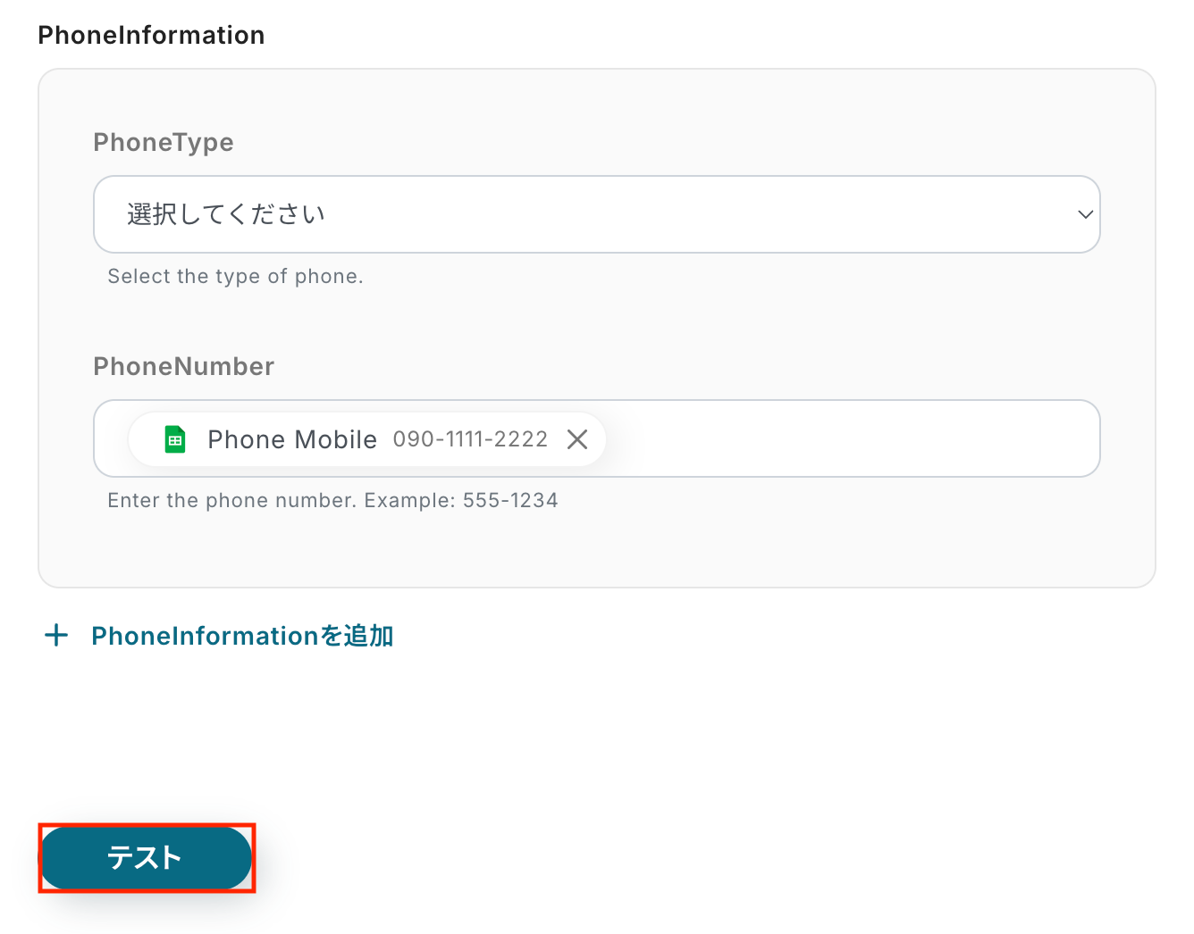 入力が完了したら、設定内容とトリガーの動作を確認するため「テスト」をクリックします。