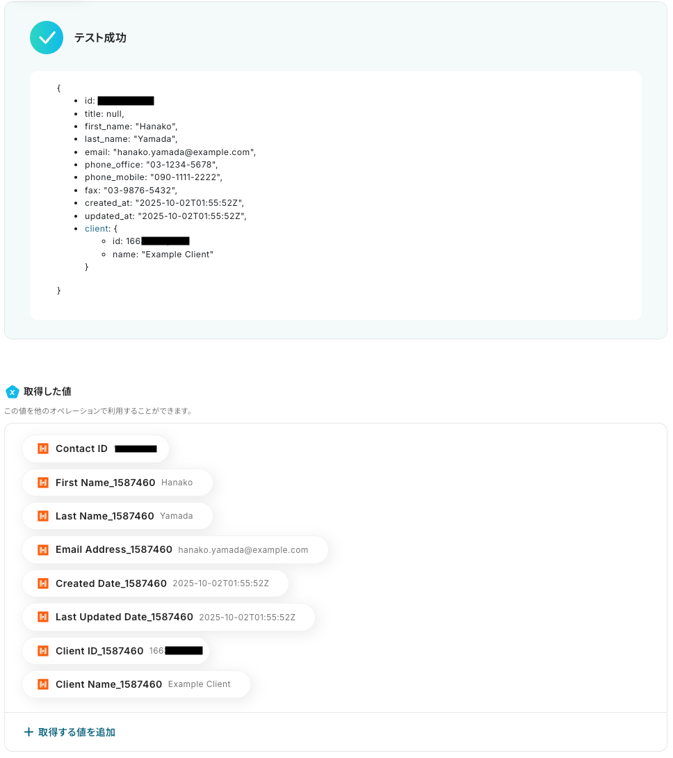 この仕組みにより、Google スプレッドシートへの一度の入力だけで、会計システムとプロジェクト管理ツールの両方に顧客情報が同期されるため、手作業による二重入力の手間と転記ミスをなくすことができます。