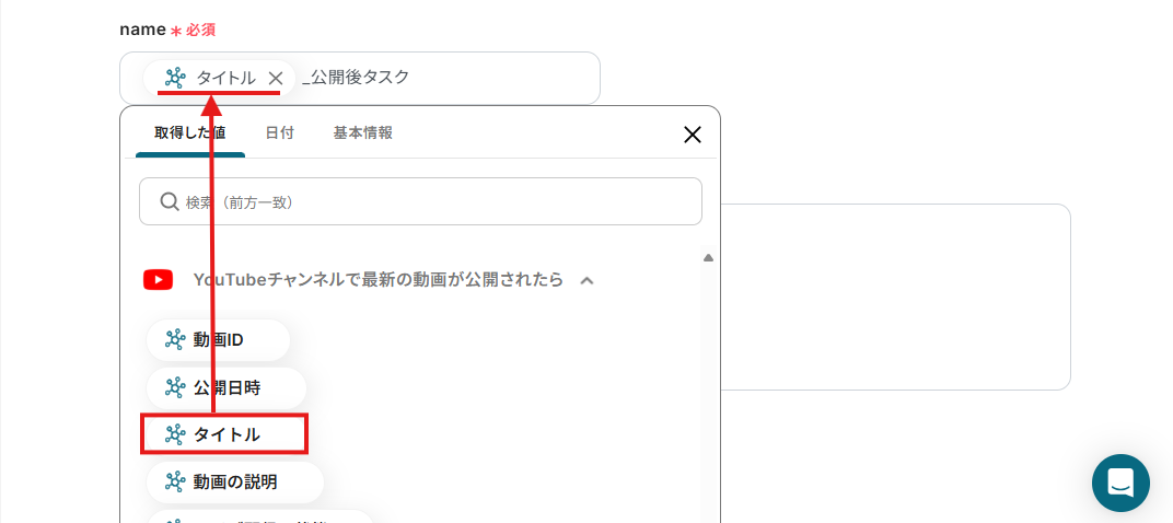 nameは、YouTubeに投稿した「タイトル」が自動で反映されます。