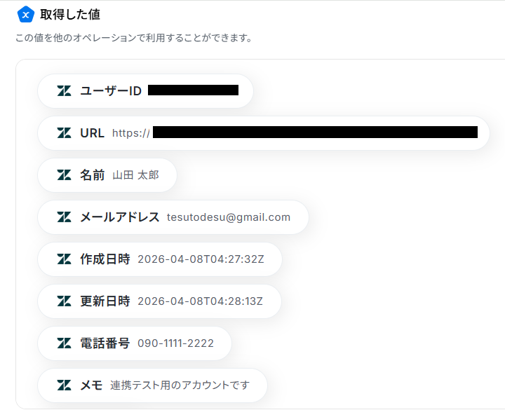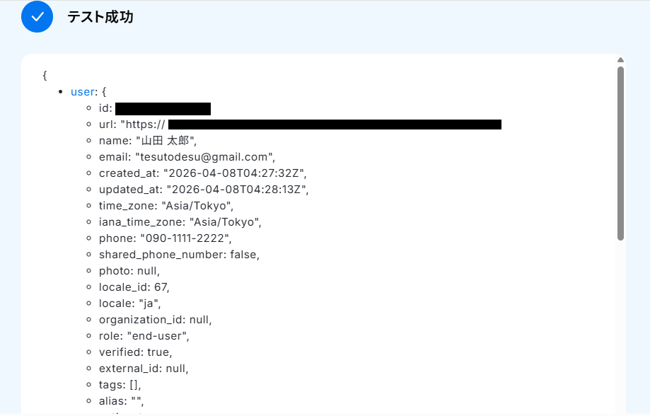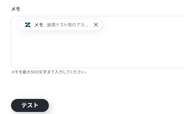 電話番号・メモの項目は、Zendeskから取得した値が設定されています。 ここまでの設定を確認できたら、「テスト」ボタンをクリックしてください。