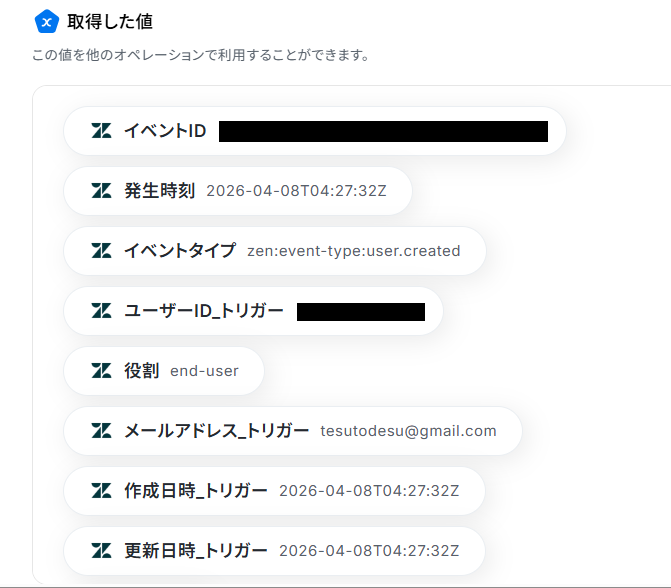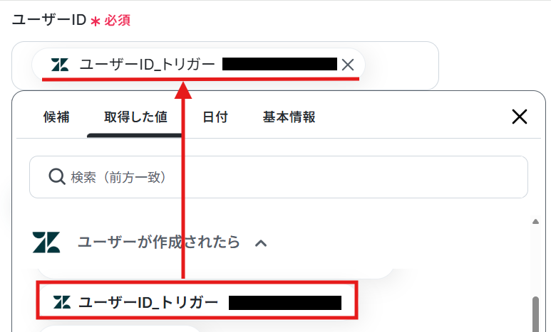 ユーザーIDは、ステップ3にて取得した値がデフォルトで設定してあるので確認してください。※取得した値を利用することで、トリガーが起動するたびに最新の値を自動で引用できます。