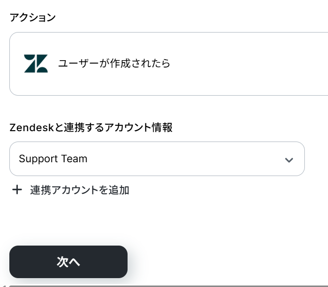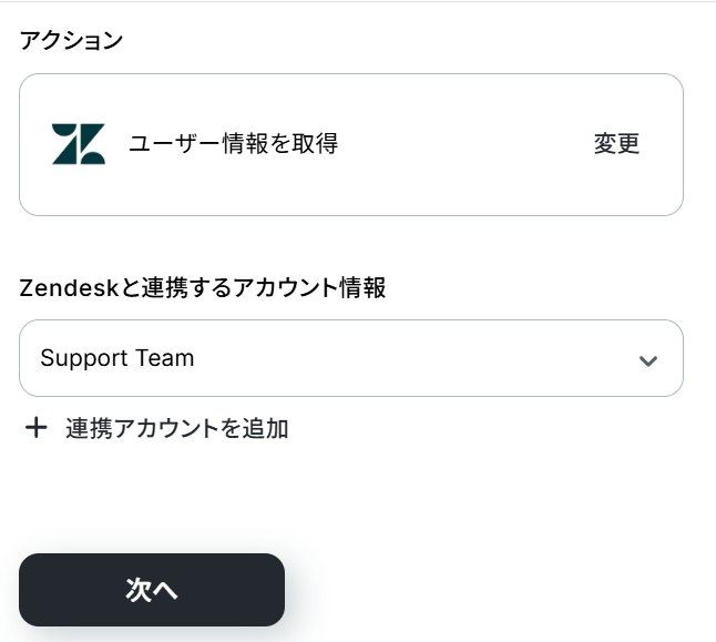 Zendeskと連携するアカウント情報は、マイアプリ連携したアカウントが表示されるので使用したいアカウントをプルダウンより選択します。 選択できたら、「次へ」ボタンをクリックしましょう。