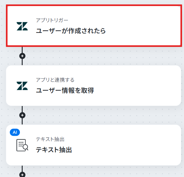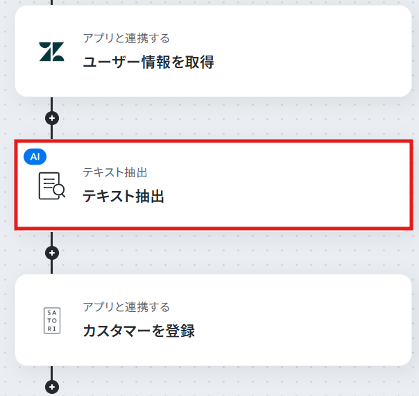 ステップ5:テキストを抽出する設定 SATORIでは、名前を登録する際に姓と名に分けて登録する必要があるため、Zendeskで作成されたユーザー情報の「名前」を「姓,名」に抽出する設定をおこないます。 「テキスト抽出 」という項目をクリックしてください。