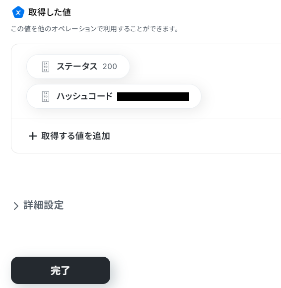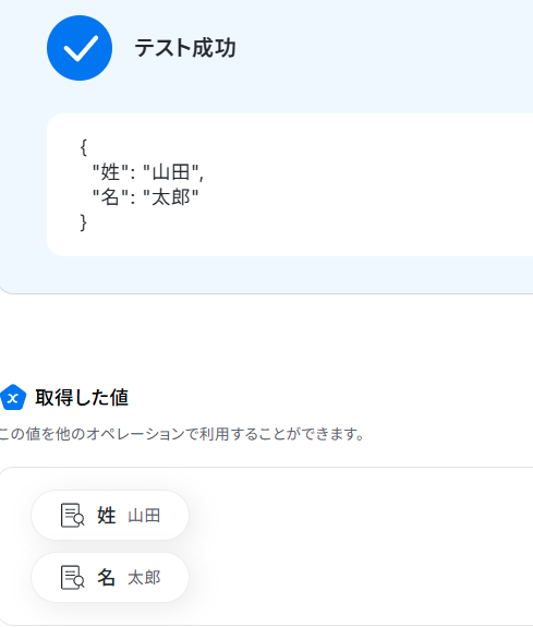 テストが成功すると、取得した値 に反映されるので、確認してください。 ここで取得したデータは、後続の設定で活用することができます。 確認し、問題無ければ「完了」ボタンをクリックしましょう。 ※取得した値 とは? トリガーやオペレーション設定時に、「テスト」を実行して取得した値のことを指します。 後続のオペレーション設定時の値として利用でき、フローボットを起動する度に変動した値となります。
