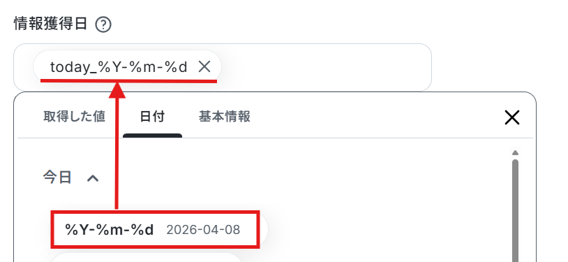 情報獲得日は、「日付」のタブから設定することで、変動した値として活用できます。