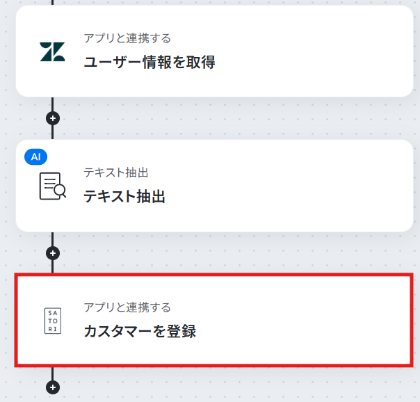 ステップ6:SATORIのカスタマーを登録するアクションの設定 最後に、Zendeskに作成したユーザー情報を引用しSATORIのカスタマーを自動で登録する設定をおこないます。 「カスタマーを登録」という項目をクリックしてください。