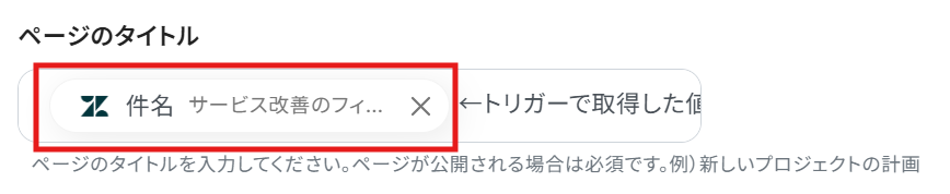 Zendeskの連携設定では、ご利用環境に応じた任意のサブドメインを設定してください。 Confluenceでページを作成するアクションでは、ページのタイトルや本文に、Zendeskのトリガーで取得したチケットの件名や内容といった値を引用し、自由に設定できます。 ■注意事項