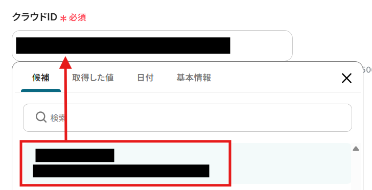 編集欄をクリックすると、連携したConfluenceアカウントのクラウド候補が表示されます。 その中から、連携したいクラウドを選択してください。 選択すると、自動でクラウドIDが反映されます。