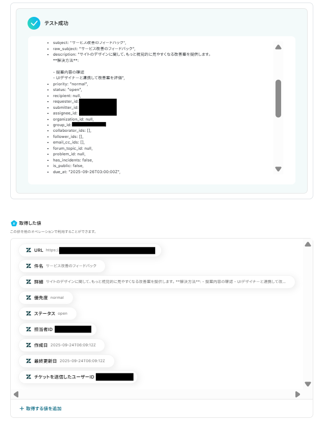 テストに成功すると、取得した値の各項目の横に Zendeskで作成したチケットの詳細情報が表示されます。 「保存する」をクリックして完了です!