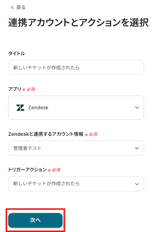 クリックすると以下の画面に移ります。 アカウント情報の項目にはステップ1でマイアプリ連携したZendeskのアカウント情報が自動で表示されます。 トリガーアクションは「新しいチケットが作成されたら」のままで次に進みましょう!