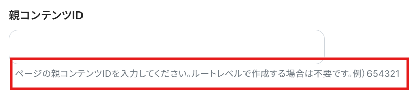 親コンテンツを指定したい場合は、赤枠内の説明を参考にIDを入力します。 IDは、親コンテンツのURLの末端部分の数字です。