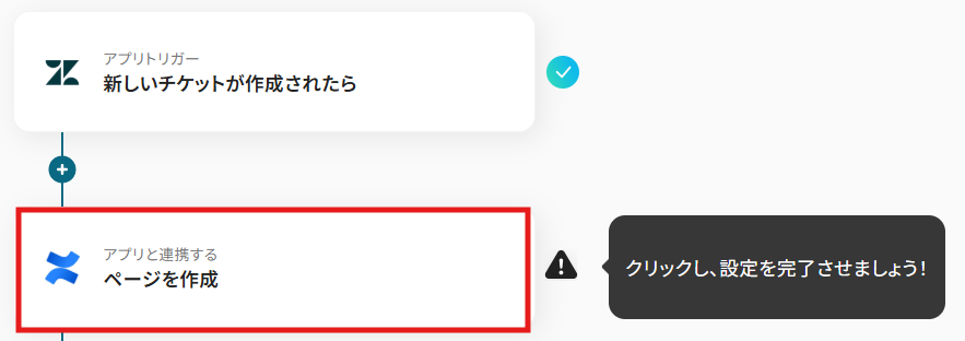 次に、Zendeskで作成したチケット情報を基にConfluenceにページを作成する設定を行います。 「ページを作成」をクリックしてください。