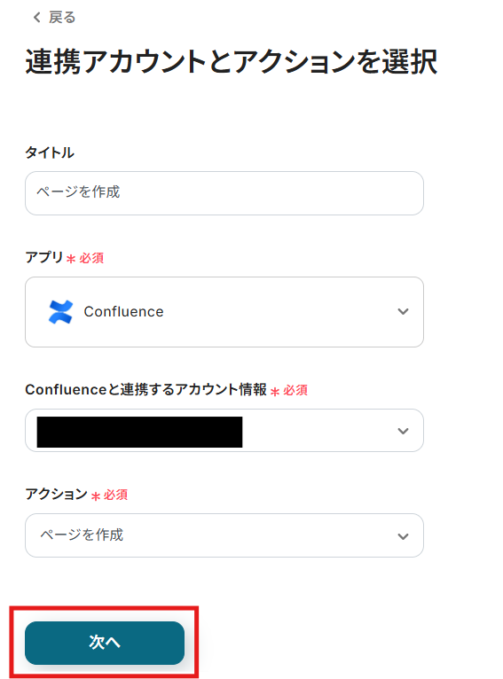 こちらもステップ1でマイアプリ連携したConfluenceのアカウント情報が自動で表示されます。 アクションは、「ページを作成」のままで次に進みましょう!