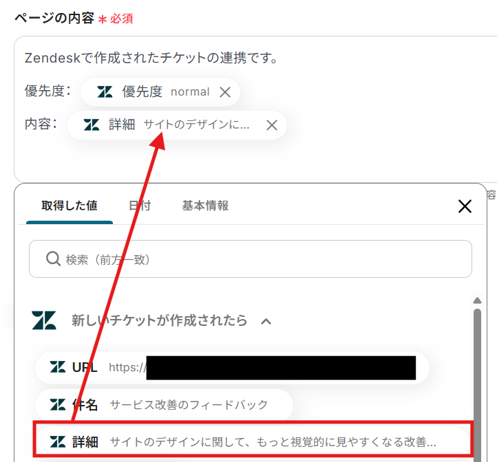 【Tips】 テキストを直接入力した部分は固定値として扱われます。 そのため、毎回変動が必要な情報(例:優先度・詳細など)はアウトプットを活用しましょう! 例えば、下記画像のように詳細を編集することができます。
