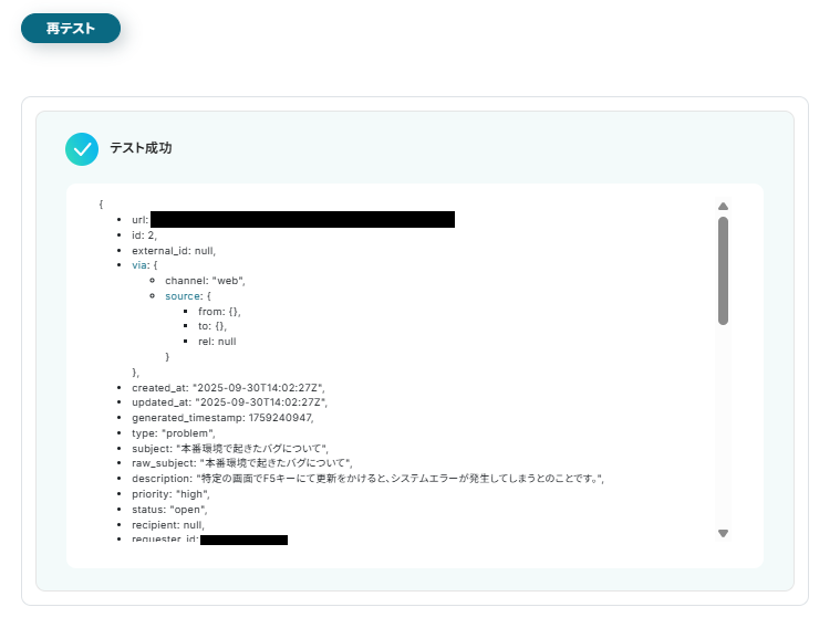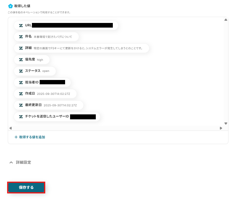 A:はい。 今回は件名のみを連携しましたが、以下の画像のように詳細や優先度、ステータス なども連携することが可能です。