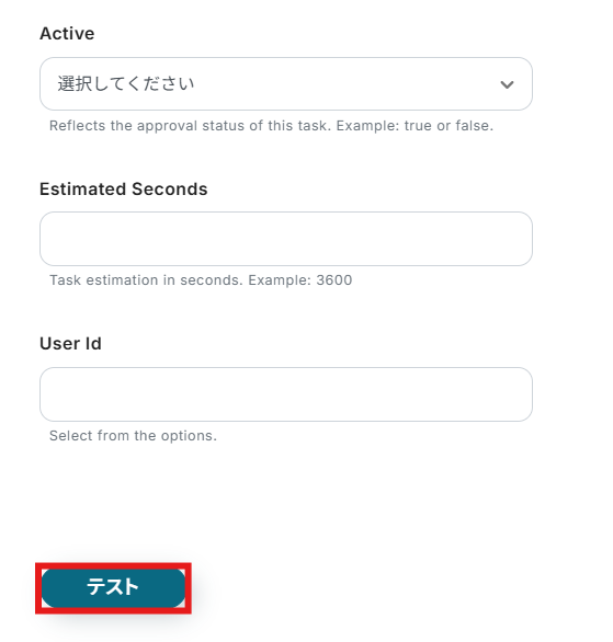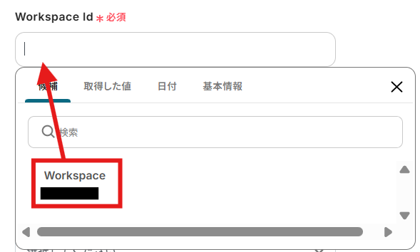 Workspace Id:プルダウンよりタスクを作成するWorkspaceを選択してください。 プルダウンには、マイアプリに登録したアカウントに紐づいて候補が表示されます。