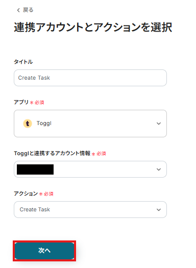 「連携アカウントとアクションを選択」画面では以下を設定します。