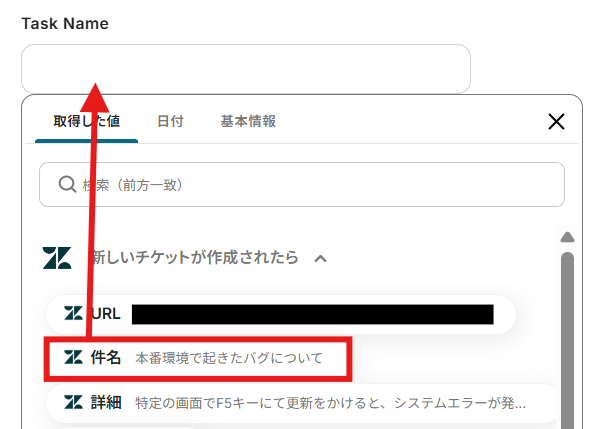 Task Name:プルダウンに表示される取得した値より件名を選択してください。 取得した値を活用することで、トリガーが実行されるたびに最新情報の反映ができます。 定型文を追加する場合は、直接入力してください。