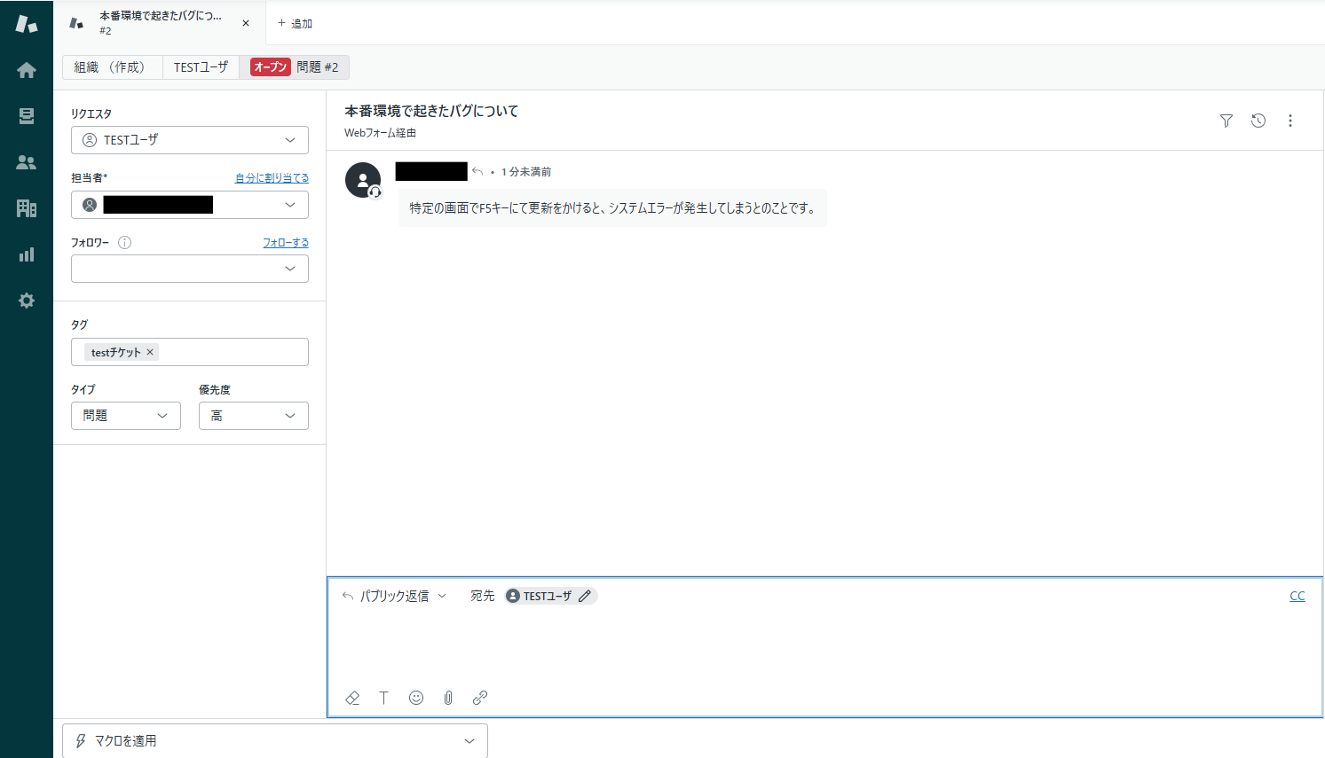 また、次の画面を操作する前にZendeskで新たにチケットを作成しておきましょう。 今回は下記のようなチケットを作成した想定で進めていきます。