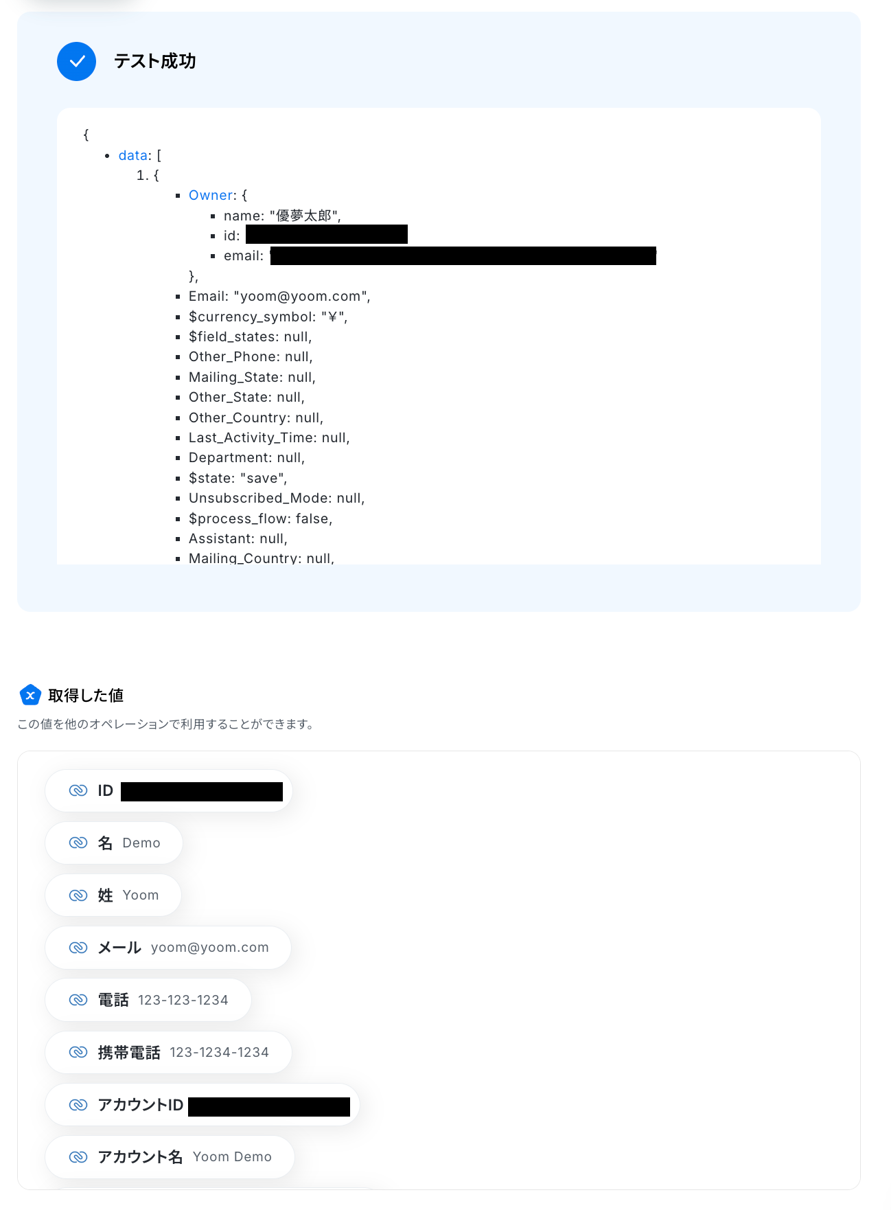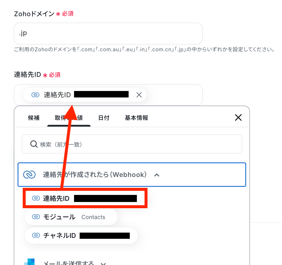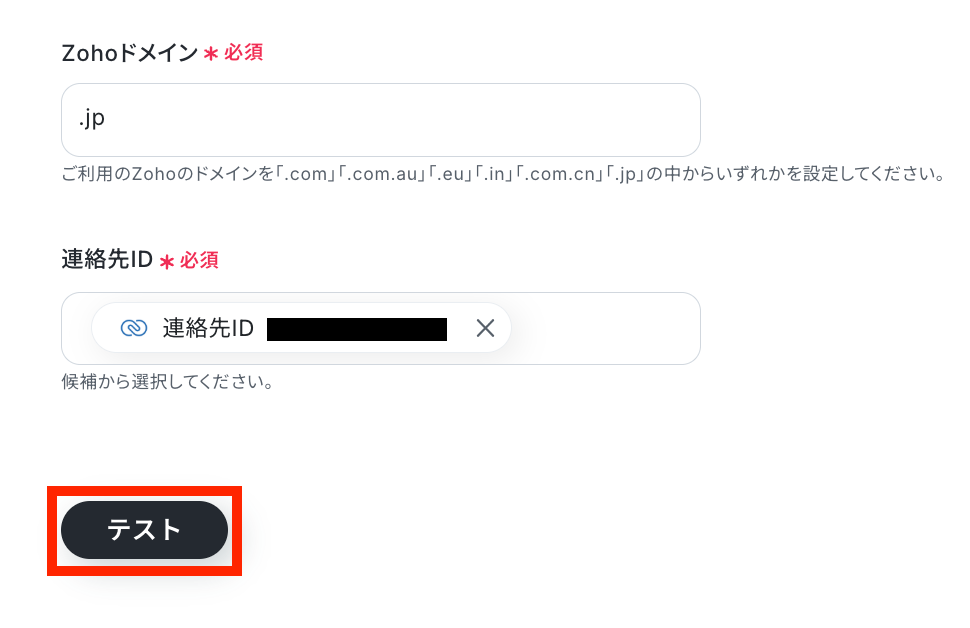 ご利用のZohoドメインを設定して、連絡先IDを取得した値から選択しましょう!