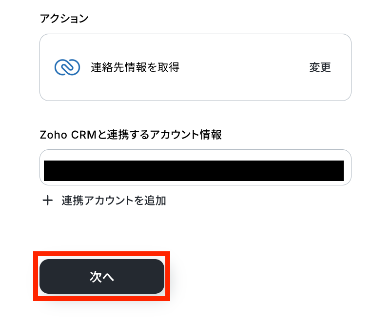 アクションは「連絡先が作成されたら(Webhook)」のままで、アカウント情報を確認します!