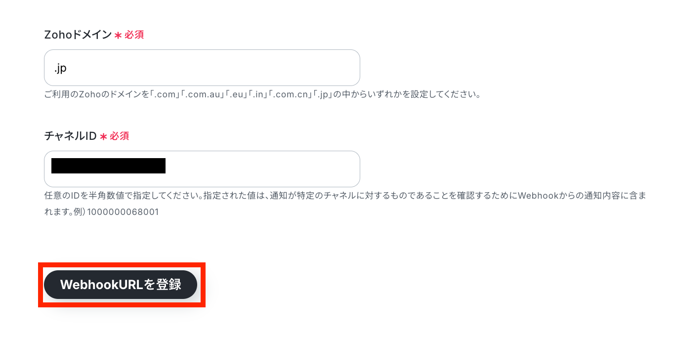 Zohoドメインを設定し、チャネルIDを入力したら「WebhookURLを登録」ボタンをクリックしましょう!