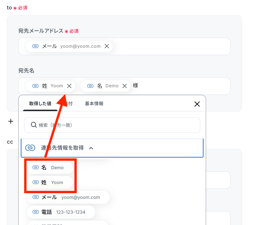 メールアドレスと宛先名は、取得した値から選択して設定しましょう。