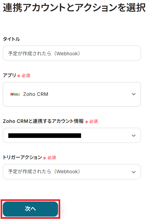タイトルと連携するアカウント情報を任意で設定し、トリガーアクションはテンプレート通りに「予定が作成されたら(Webhook)」のまま「次へ」をクリックします。