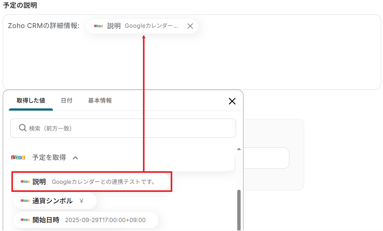 予定IDの欄にはZoho CRMの「予定ID」の値が予め設定されているので、そのままで大丈夫です。
