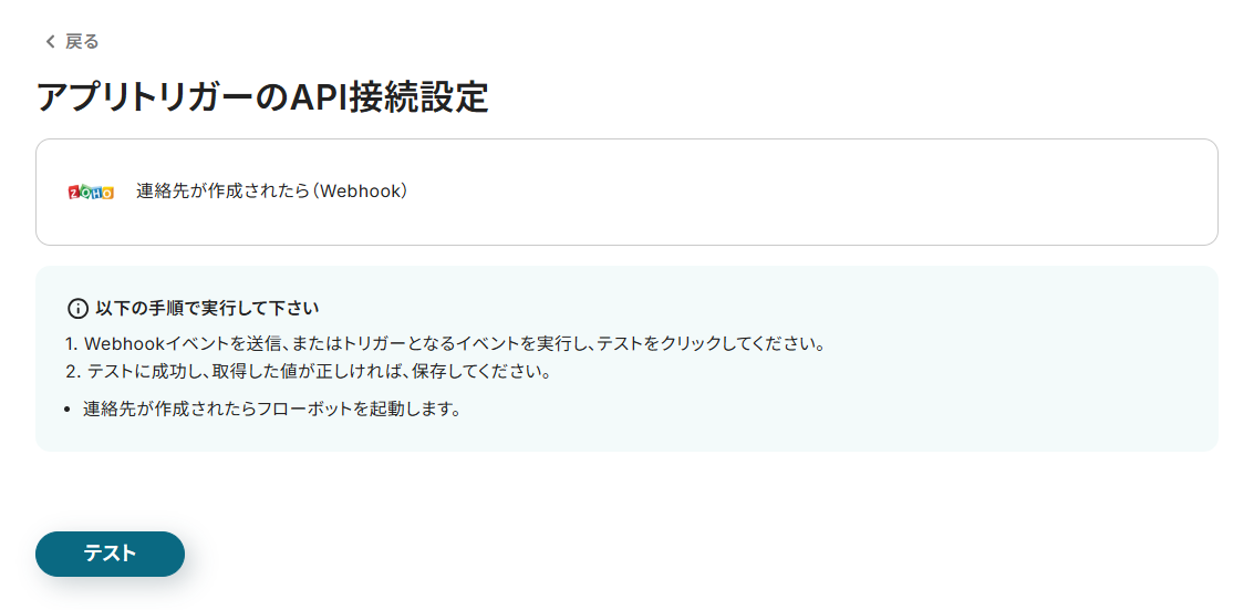 - ここでの設定により、Zoho CRMに連絡先が作成されるとフローボットが起動します。