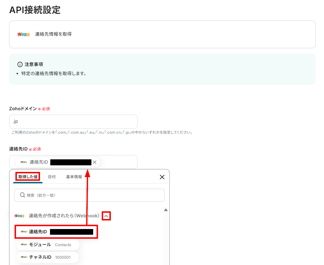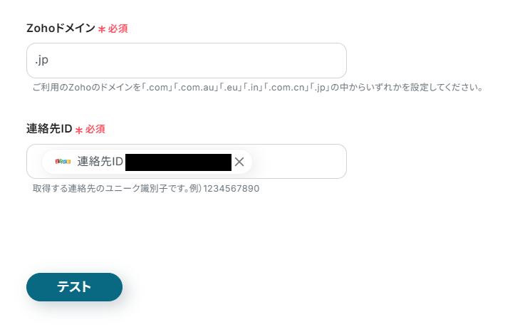 Zohoドメインを枠下の注釈に沿って入力し、連絡先IDを取得した値から設定してください。