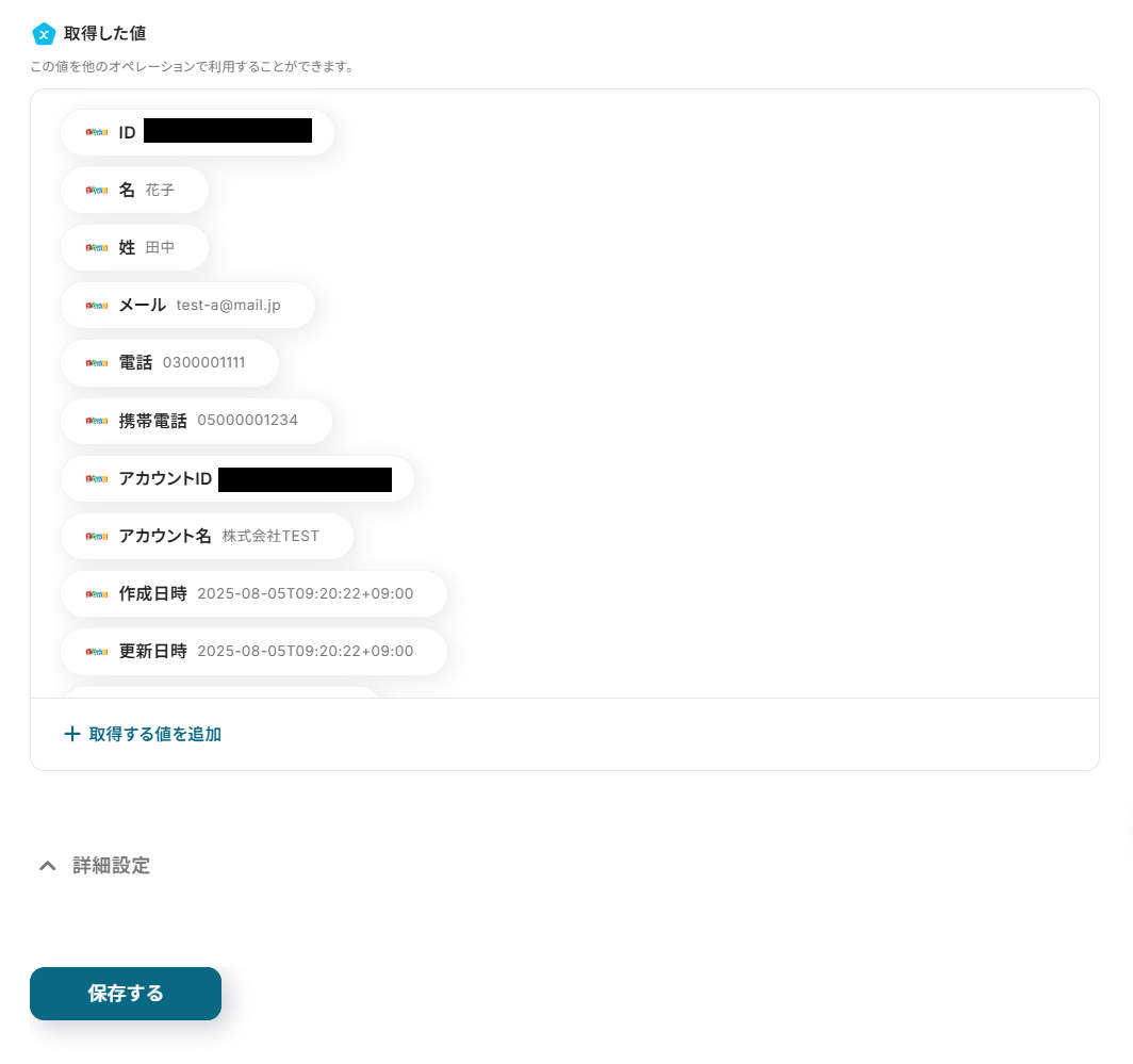 テストが成功すると連絡先情報が取得されるので、確認したら保存します。