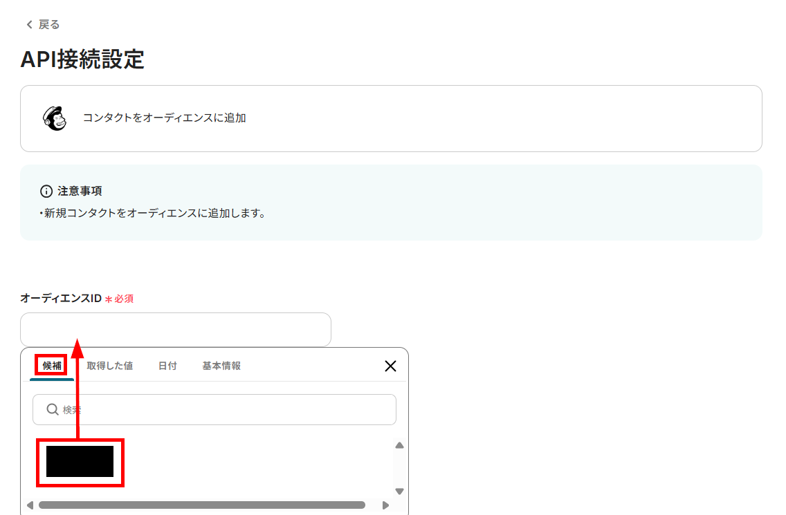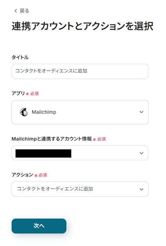 Zoho CRMから取得した値を利用して、Mailchimpのオーディエンスにコンタクトを追加する設定を行います。