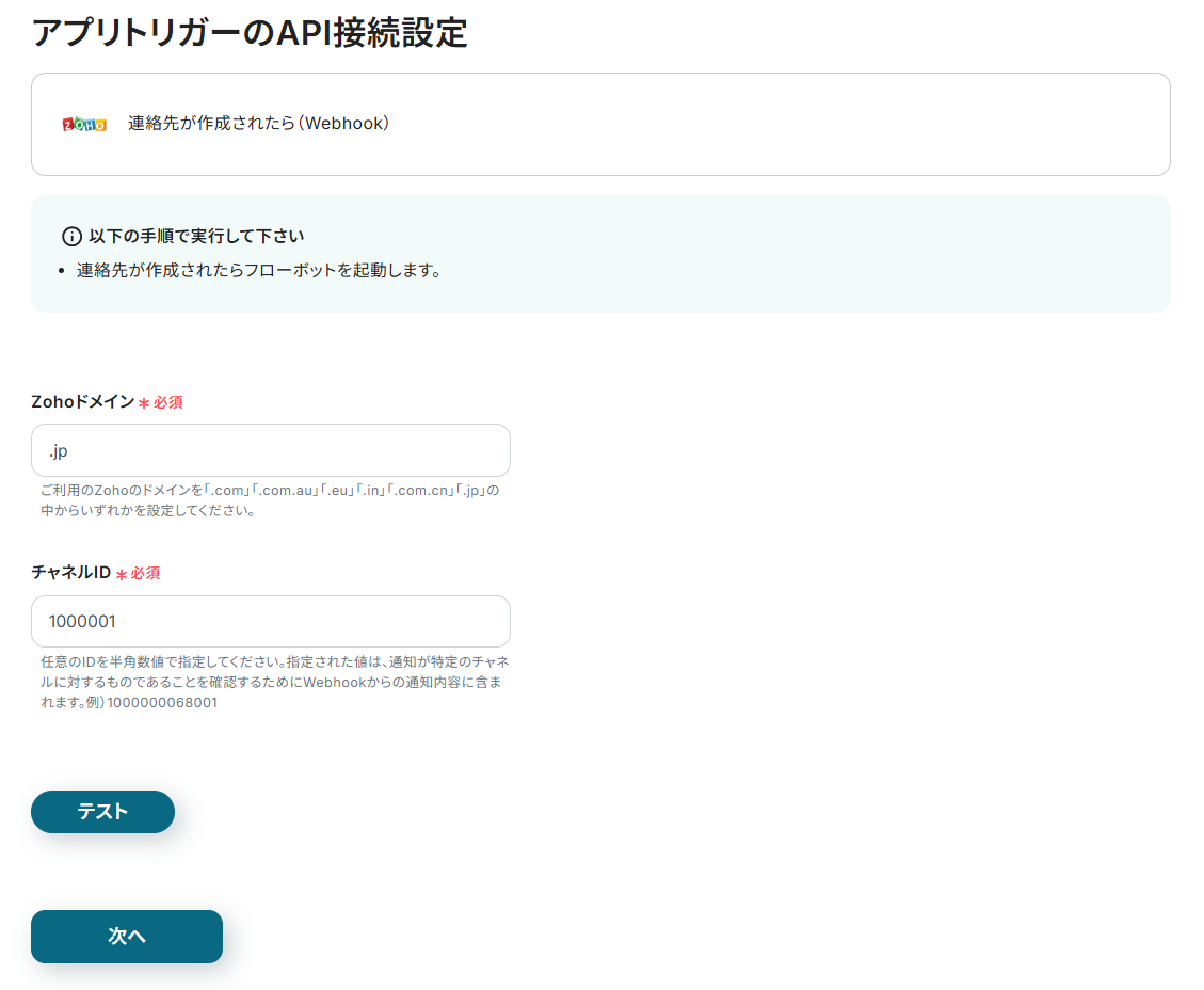 ZohoドメインとチャネルIDを枠下の注釈に沿って入力し、テストを行います。
