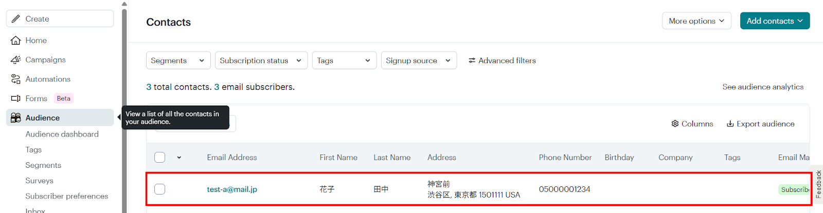 テストが成功すると、Mailchimpにコンタクトが追加されるので確認してください。