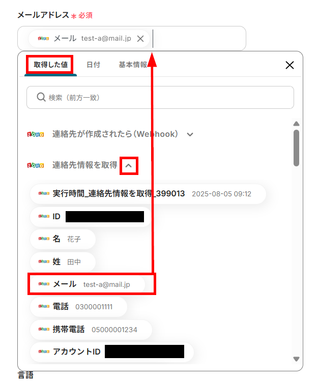 続いて、ステップ3で取得した連絡先IDを利用して、連絡先情報の詳細を取得する設定を行います。