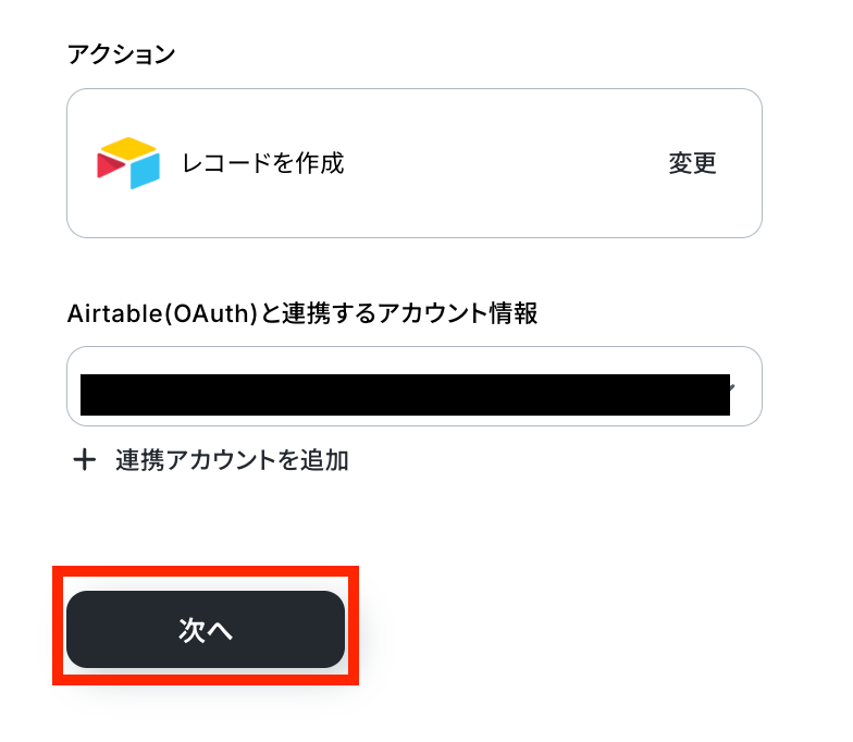 取得した値を用いて、 Airtableでレコードを作成する設定を行います。