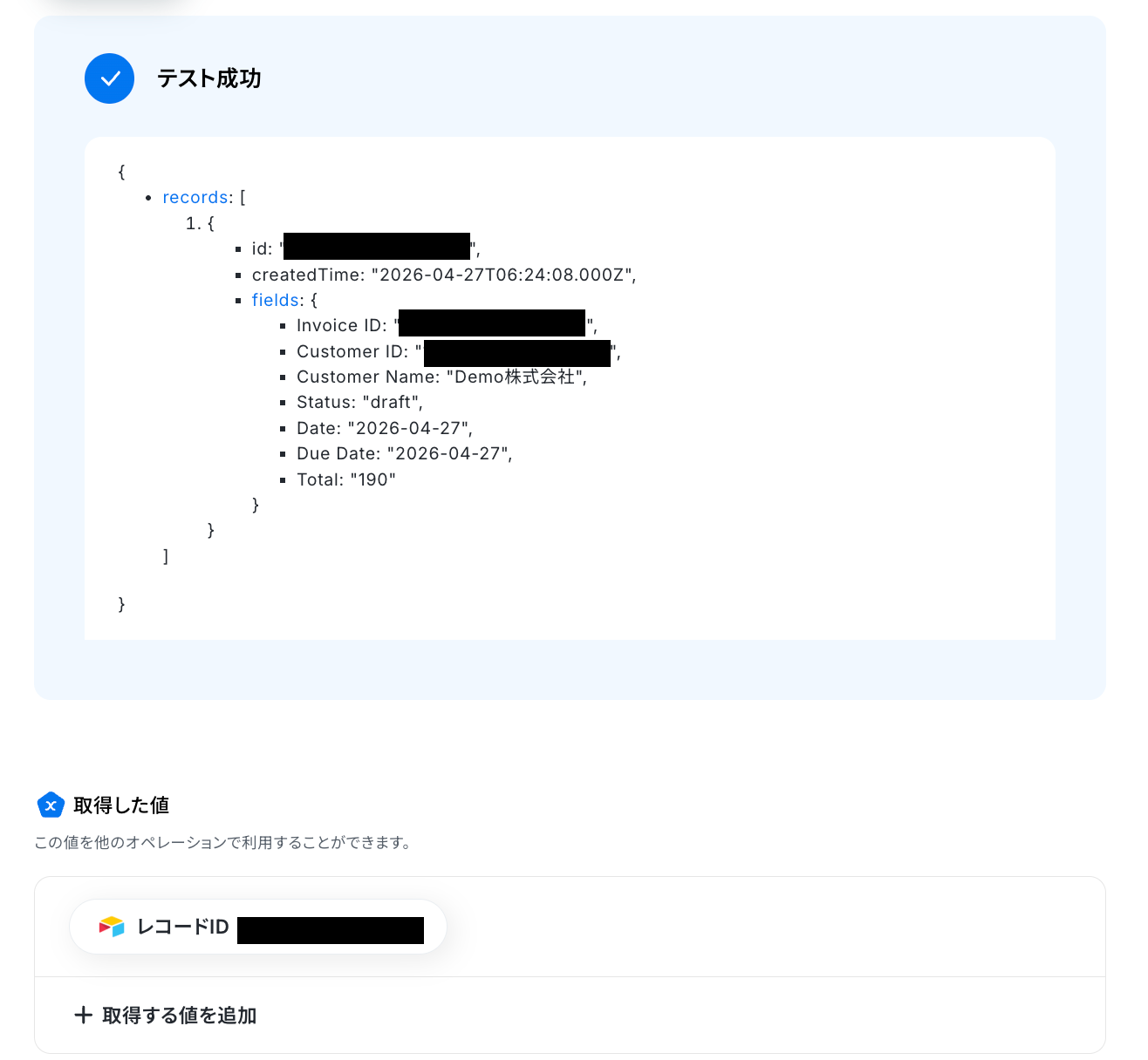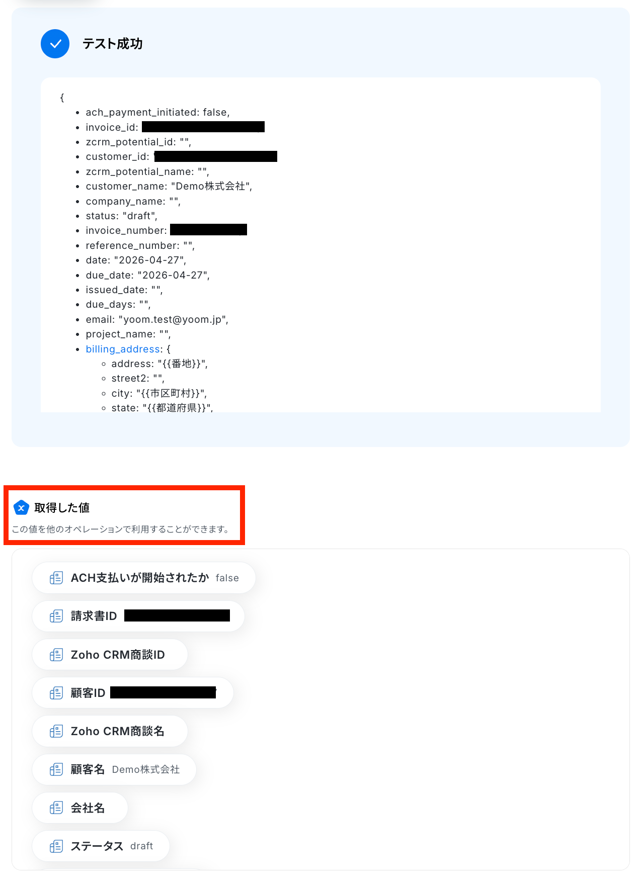 テスト成功で、請求書の情報が取得した値に反映されます。