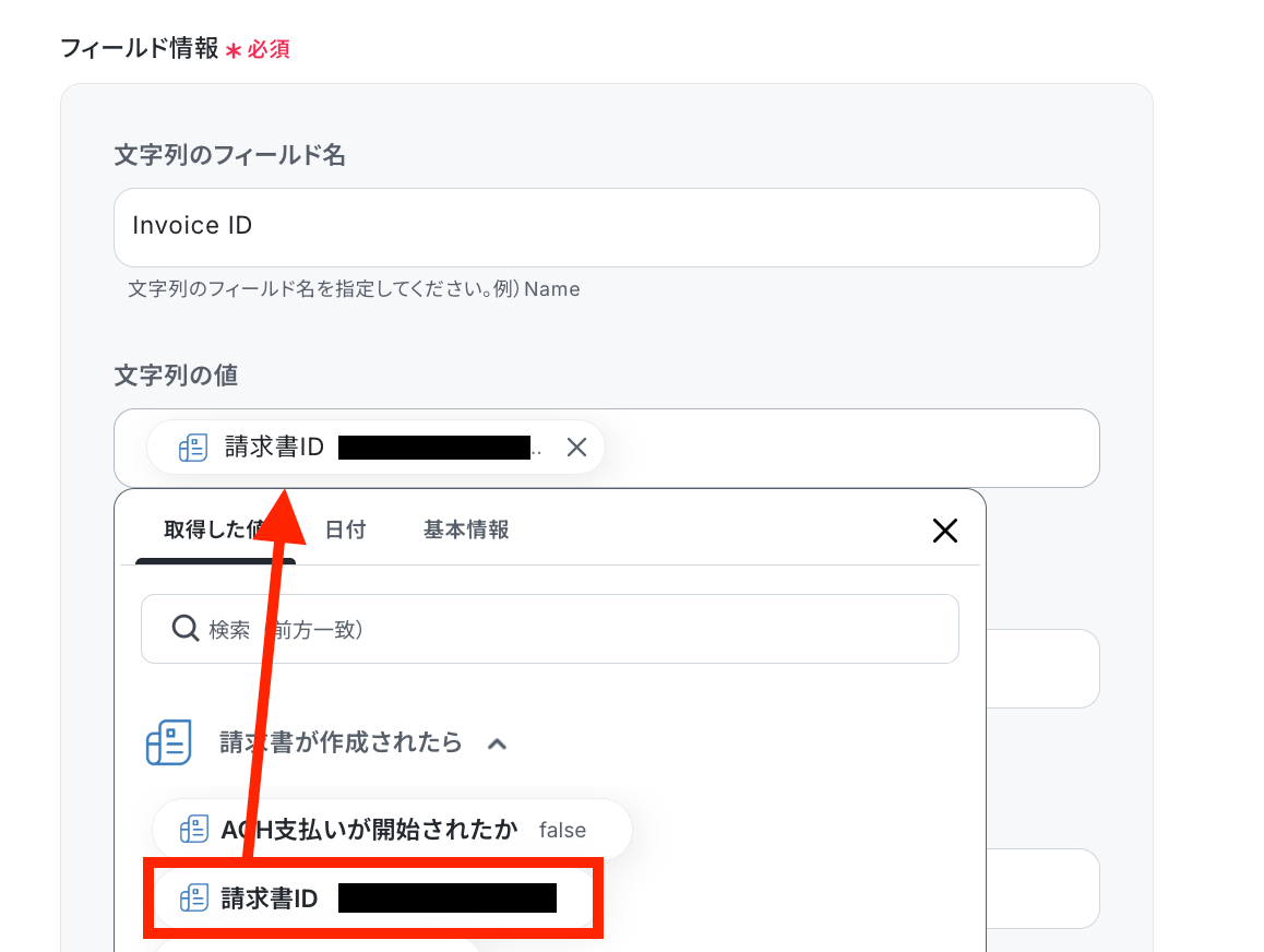 フィールド名を設定して、値は対応するものを取得した値から選択します。
