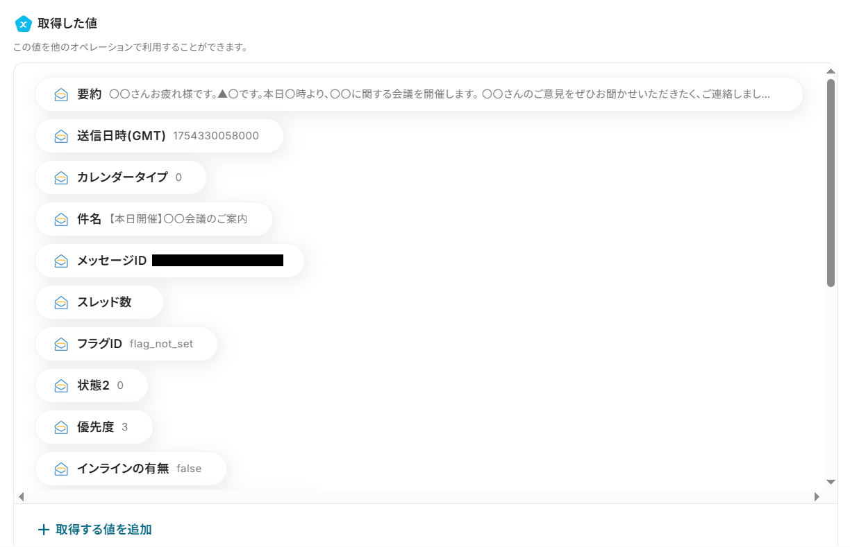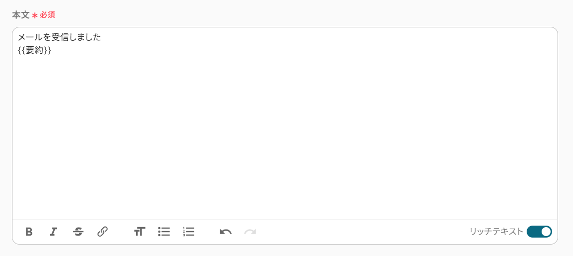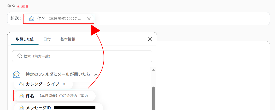件名の設定を行います。 件名は自由に設定できますが、直接文字を入力すると毎回同じ文字が送信されてしまうため、注意が必要です。 また、入力欄をクリックし取得した値から選ぶことも可能です。 例えば、取得した値から件名を設定すると、毎回受信したメールの件名をそのまま設定できます。