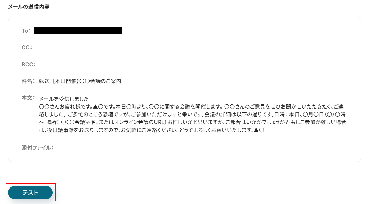 メールの送信内容を確認します。 内容を確認し、問題なければ「テスト」をクリックしましょう。