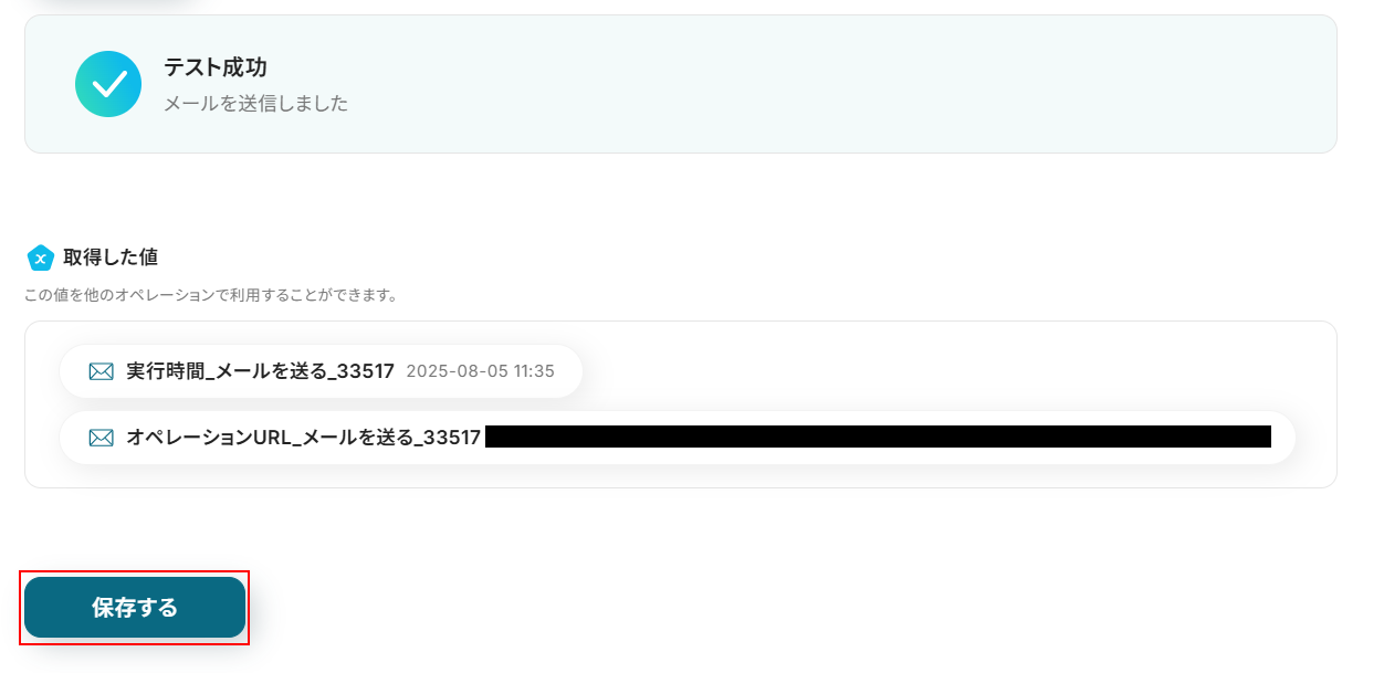 テストに成功すると、テスト成功画面が表示されます。 また、実際にメールも送信されていますので確認しておきましょう。 ここまで確認できたら、忘れないように「保存する」をクリックします。