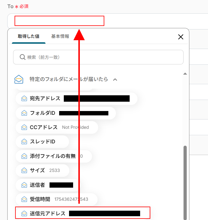 送り先(To)の設定を行います。 Outlook宛てのアドレスを選択しましょう。 今回は入力欄をクリックし取得した値から選択しましたが、直接アドレスを入力することも可能です。